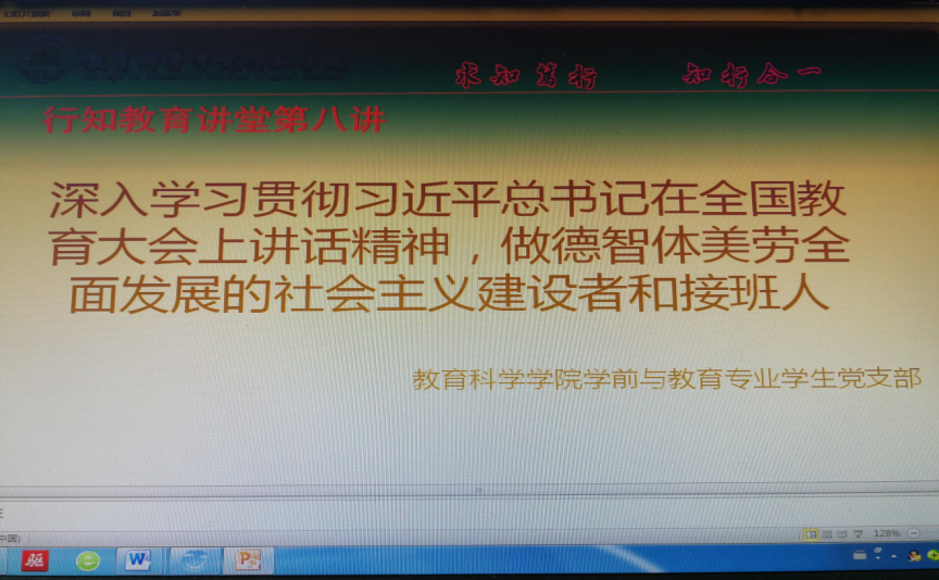 为深入学习贯彻习近平总书记在全国教育大会讲话精神,2019年1月2日——8日,我院学生党支部于文综楼A307开展了习近平总书记在全国教育大会上讲话精神宣讲活动。宣讲活动由学前与教育专业学生党支部的杨玉常、邱淑琴主讲,我院2017级和2018级全体学生参加了此次宣讲活动。