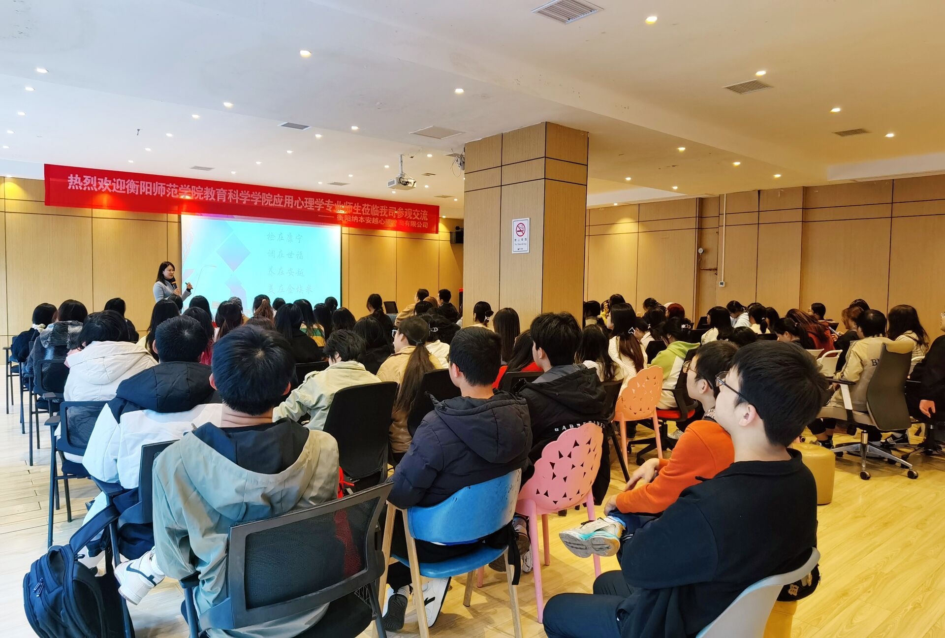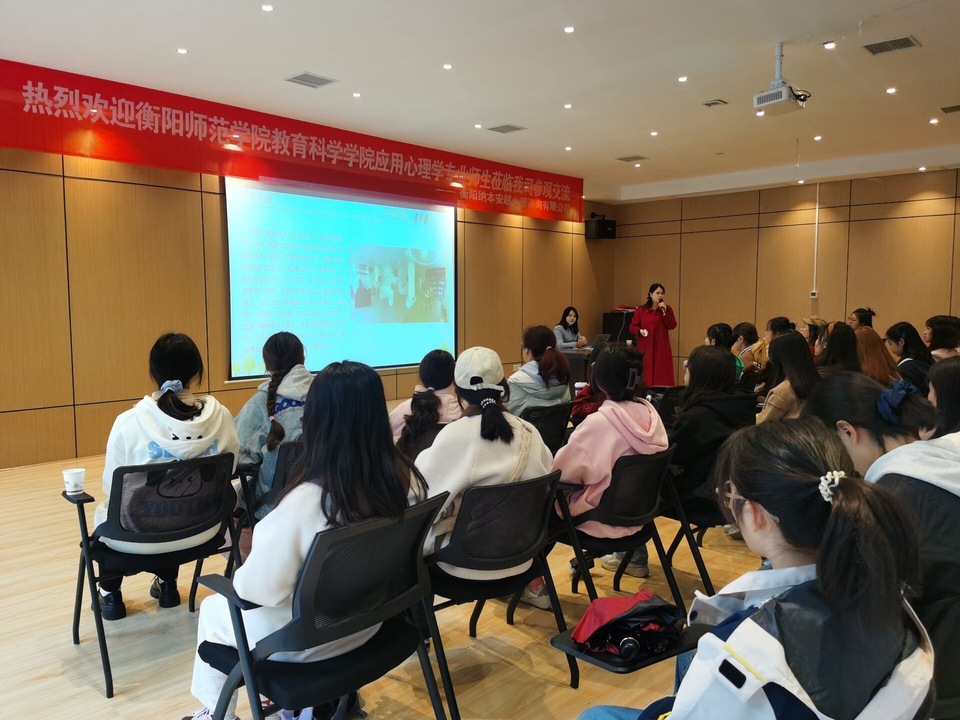 在公司工作人员的带领下,学生们首先参观了公司的办公场所和设施。公司宽敞明亮的环境与温馨细致的设计,充分体现了其“海纳百川、以人为本”的运营理念。随后,在公司的报告厅,公司经理赵梦醒和贺君菊老师为学生们详细介绍了公司的服务领域、专家团队、服务特色及案例,尤其是企业EAP服务的独特优势。两位老师还分享了新手咨询师的成长与职业发展路径,并通过现场演练心理咨询流程,为学生们提供了直观的学习体验。在互动交流环节中,她们耐心解答了学生们对心理咨询行业的各种疑问与困惑。