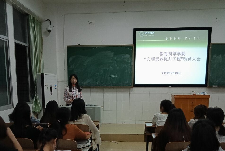 为加强文明学院建设,提高学生文明素质, 9月29日晚我院于外北301和文A311教室分别召开18级和16级“文明素养提升工程”动员大会,参加此次动员大会的有党总支书记陈君生、副书记罗耒英、辅导员曹喜燕老师及2018、2016级全体学生。