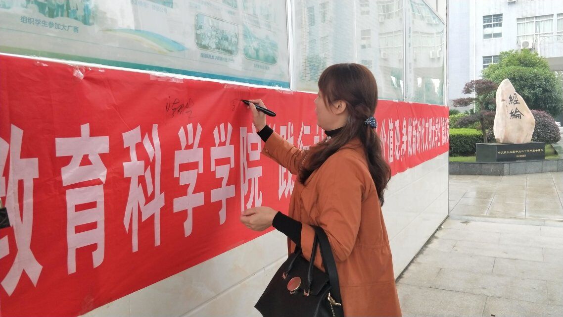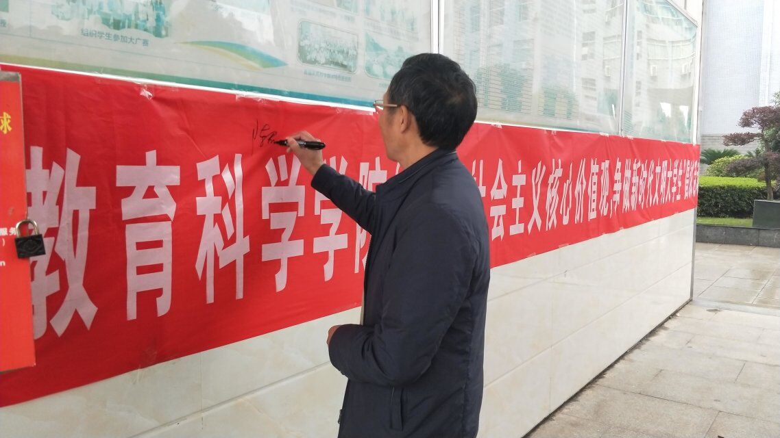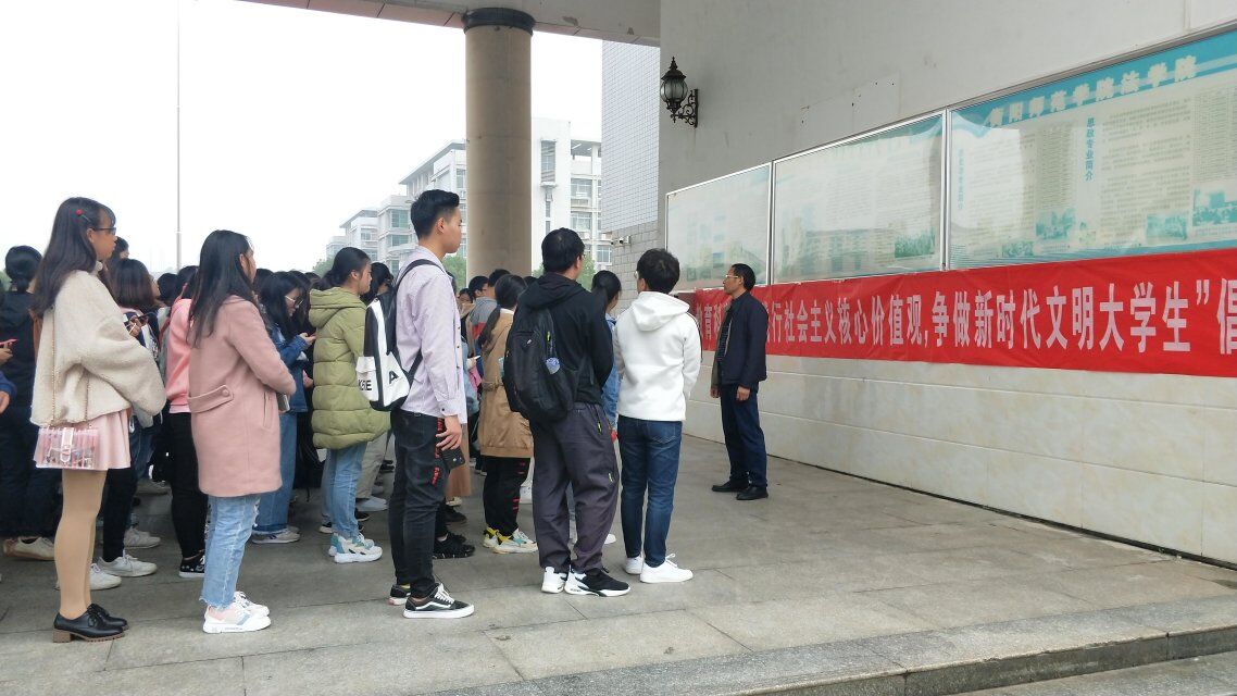 10月22日上午11:00我院于文综楼AB大厅举办以“践行社会主义核心价值观,争做新时代文明大学生”为主题的文明倡议签名活动。我院党总支书记陈君生、党总支副书记罗耒英以及太阳成集团tyc9728全体学生参加此次活动。