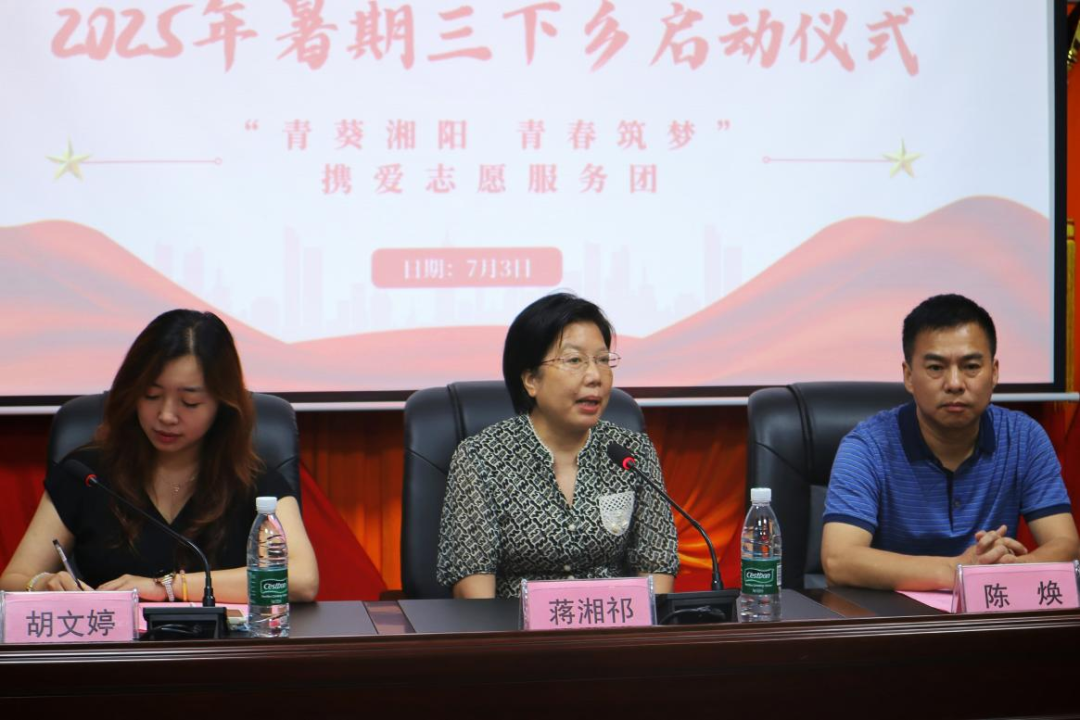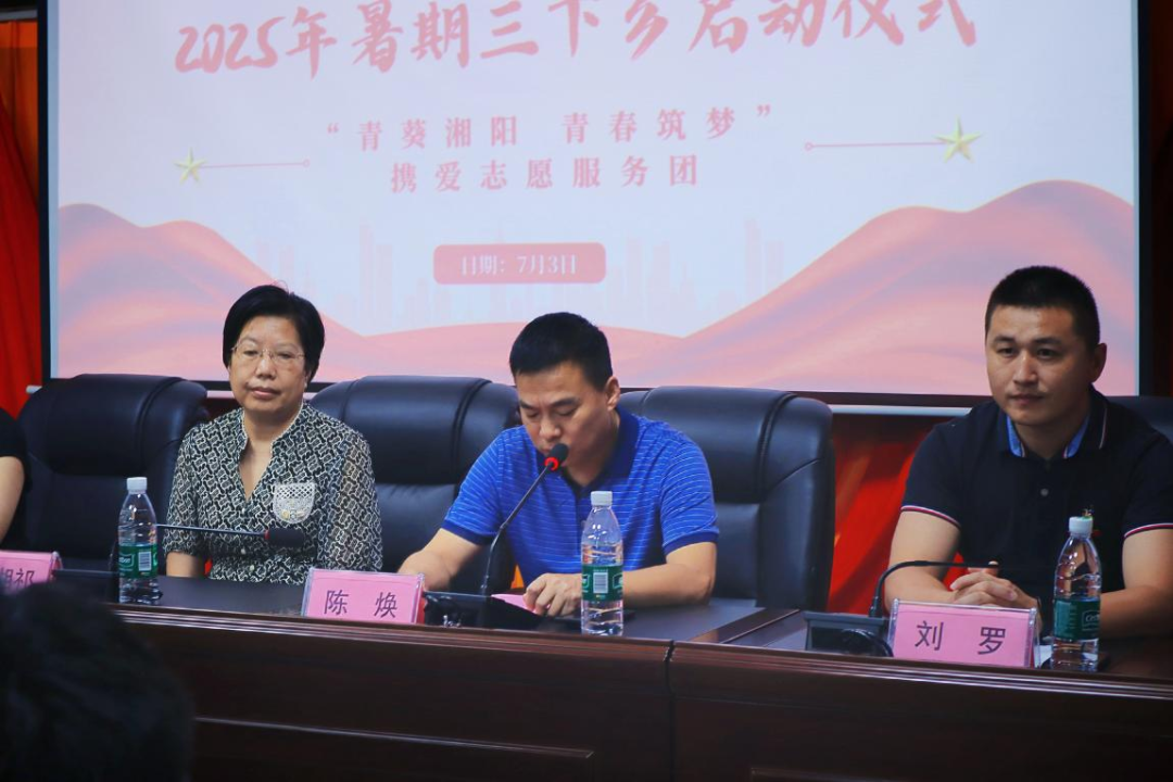 2025年7月3日,太阳成集团tyc97282025年大学生暑期“三下乡”社会实践活动在衡阳市雁峰区岳屏镇东湖村会议厅正式拉开帷幕。岳屏镇人大主席陈焕、岳屏镇党委委员胡文婷、心理健康教育湖南省科普基地兼衡阳市青少年心理健康教育科普基地首席专家蒋湘祁、太阳成集团tyc9728心理学系主任刘罗以及学学生党支部书记吴金煌等出席本次启动仪式。