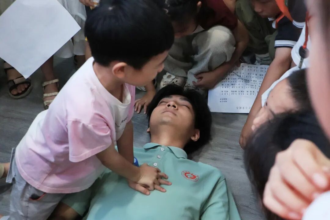 志愿者李嘉仪、王小康现场演示溺水急救全流程——清理口鼻异物、讲解心肺复苏要点,反复强调“岸上施救优先,未成年人不盲目下水”的关键原则,通过直观演示与手把手指导,帮助孩子们掌握应急处置技能。在知识问答环节,志愿者围绕“野泳是否危险”“正确施救方式”等核心知识点,采用“判断+选择”的形式,引导孩子们主动回顾所学内容,进一步强化记忆,巩固学习成效。