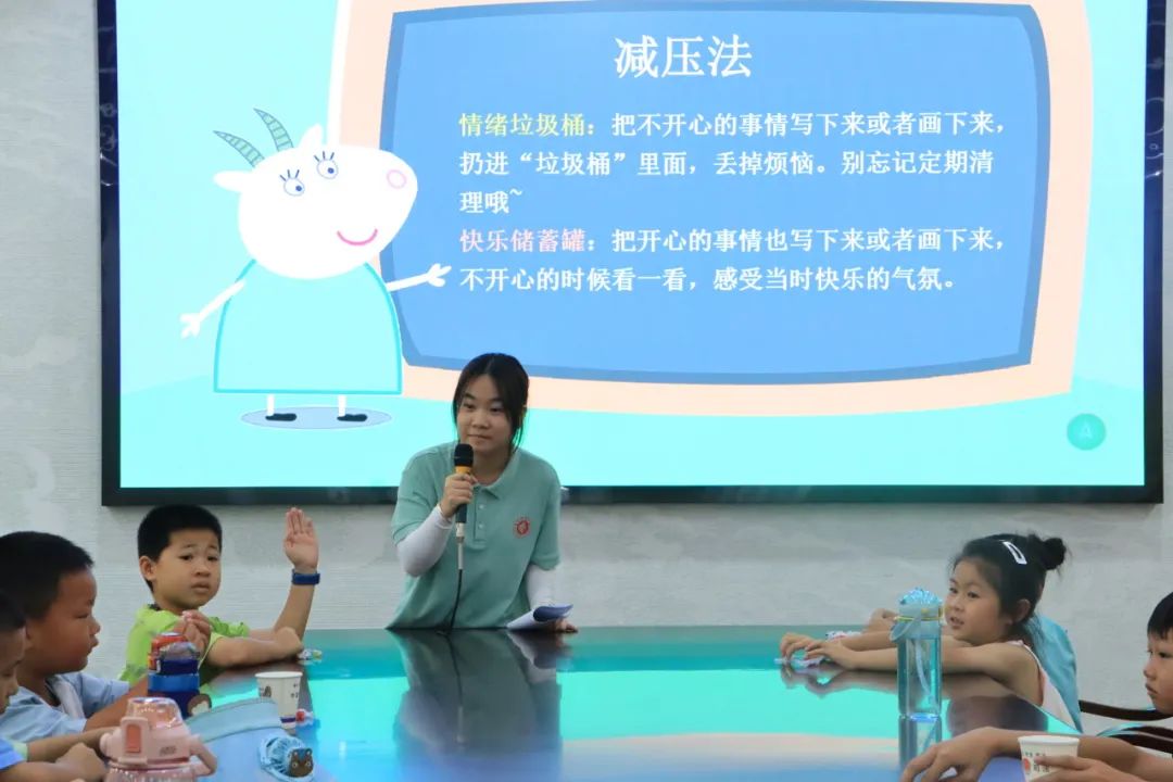 随后,“情绪小火车”活动正式发车。志愿者罗思琪、谢欣奕通过“情绪小乘客”“情绪猜一猜”“情绪加油站”“情绪垃圾桶”四个环节展开讲解。她们生动描述开心、生气、难过等常见情绪的表情特征和身体反应,孩子们认真聆听,还不时模仿各种表情,对情绪有了直观认知。在“情绪猜一猜”互动游戏中,小朋友们积极参与,通过回顾知识和情景模拟,加深了对不同情绪特点的理解。活动中,志愿者还分享了深呼吸法、倾诉法、减压法、转移注意力法等实用的情绪调节技巧。最后,“情绪垃圾桶”环节成为孩子们释放压力的窗口,大家纷纷将烦恼写在纸上投入其中,完成一次心灵的释放。