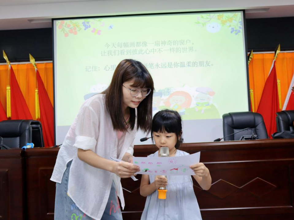 绘画完成后,活动迎来了第一个动人环节——“我的故事我来讲”。在志愿者温暖鼓励的目光下,孩子们勇敢走上台前,自信讲述画作背后的奇妙故事。有的孩子用稚嫩的声音描绘出“石头飞船”的星际探险,有的则分享了“树叶精灵”守护森林的温情童话。每一次分享都伴随着伙伴们的真诚掌声。这个环节不仅为孩子们提供了表达内心世界的安全舞台,锻炼了语言组织与表达能力,更在真诚的讲述与倾听中,建立起情感联结,让勇气与自信悄然生长。