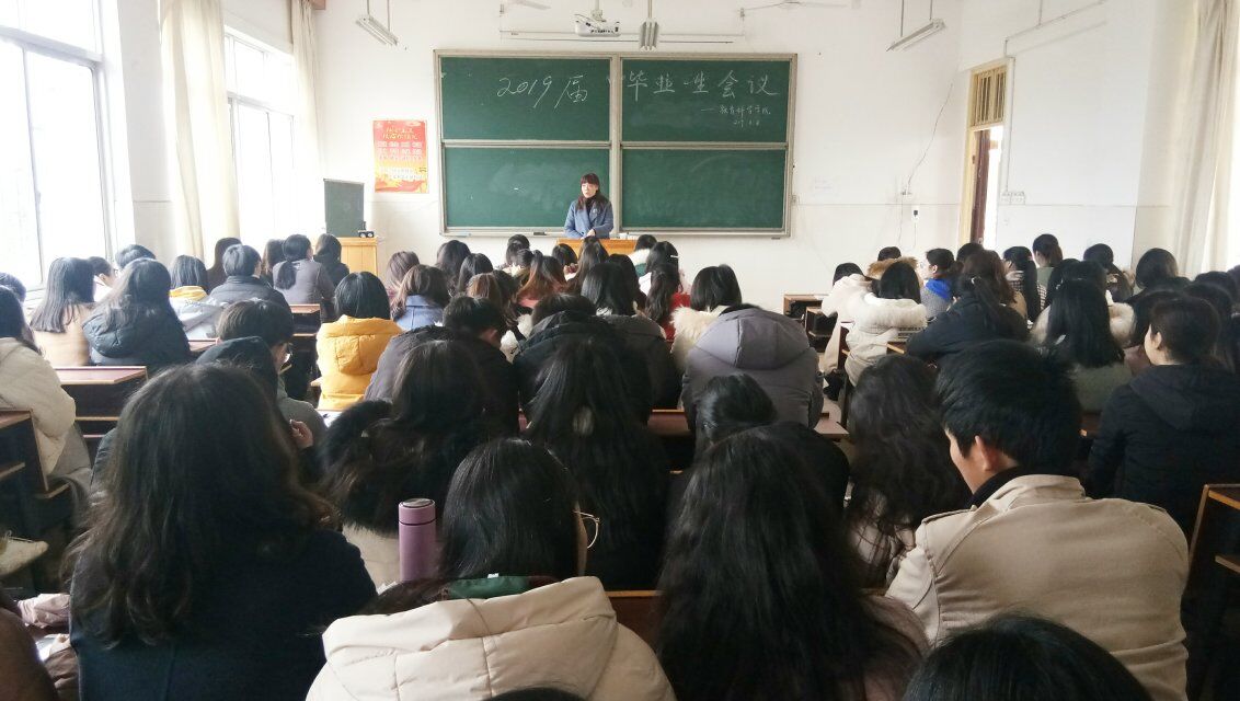 王老师首先发言,他以“天使早报喜”五个字总结毕业生工作的注意事项和要求。“天”是希望同学们填好问卷;“使”是希望同学们在毕业论文上使足劲,尽快完成毕业论文;“早”是希望同学们早日找到工作;“报”是希望同学们将相关报道的信息填好;“喜”是希望同学们注意安全问题,切勿陷入传销组织。