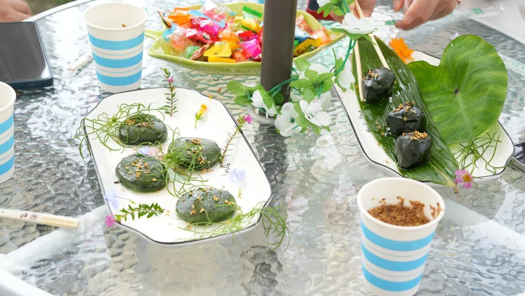 活动现场,行知小苑户外桌椅上摆放着精美的青团、艾草糍粑。帮帮团小导师一边邀请师生品尝,一边讲解制作工艺。软糯香甜的口感中,师生们不仅品尝到劳动成果的甘甜,更读懂了传统美食背后“顺应天时、物尽其用”的生存智慧。
