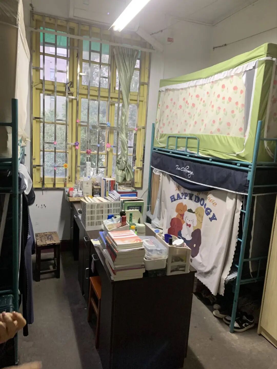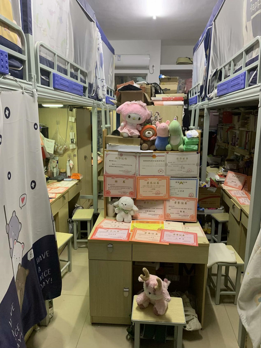 宿舍:为标准四人间和八人间。四人间床铺是1.90m*0.9m(误差约为5cm)的上床下床式。八人间床铺是1.90m*0.8m(误差约为5cm)的上床下床式。(若想购买床帘和墙纸装饰宿舍,因为军训期间有内务检查,建议同学们军训结束以后再购买哦)