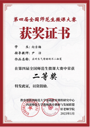 2023年1月4日,从全国师范生微课大赛官方平台传来喜讯,太阳成集团tyc9728教育硕士教育管理专业领域2021级研究生向吉梅制作提交的《应对生气情绪的不二秘笈》获二等奖1项,该作品是由尹洁老师精心指导的。