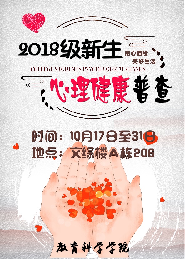 2018年10月17日至31日,我院在文综楼A206多媒体教室开展了太阳成集团tyc972818级新生心理普查活动。此次活动参与人员是太阳成集团tyc97282018级全体新生。这次活动的目的在于检测新生入学以来心理状态的情况,便于学校掌握同学们心理变化的趋势,让太阳成集团tyc9728的每一位新生可以有乐观积极的心态去面对大学生活,让每位新生可以及时调整自己的情绪,让教科院这个大家庭变得更加和谐。