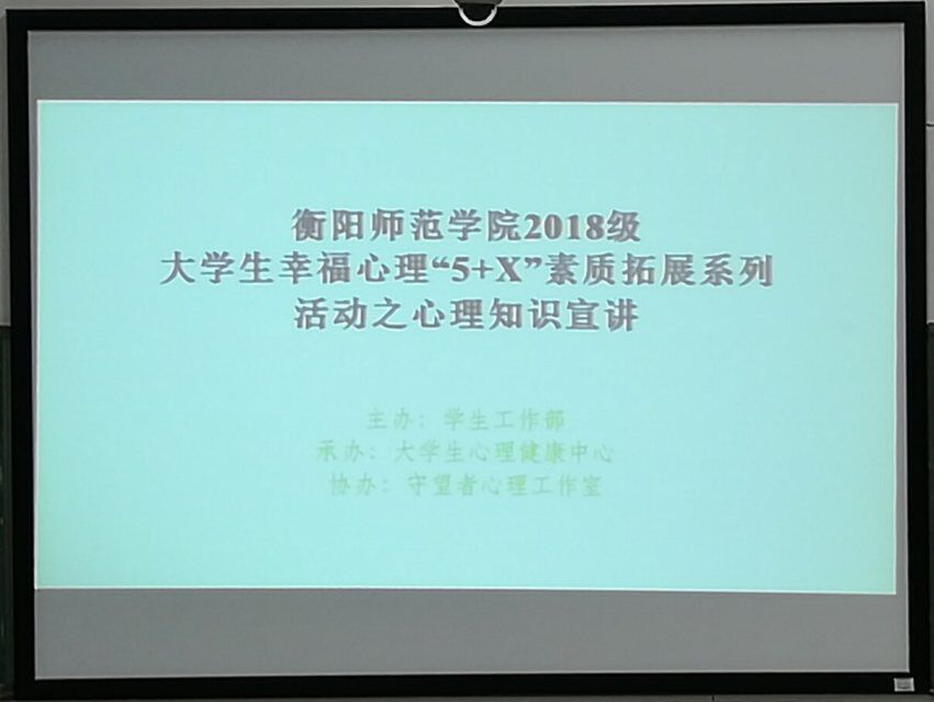 2018年10月24日晚7:30,我院在外北301举行了2018级的幸福心理“5+X”素质拓展系列活动之心理知识宣讲,此次活动的目的是为了让大家重视心理问题,并向大家介绍了大学生心理健康中心。