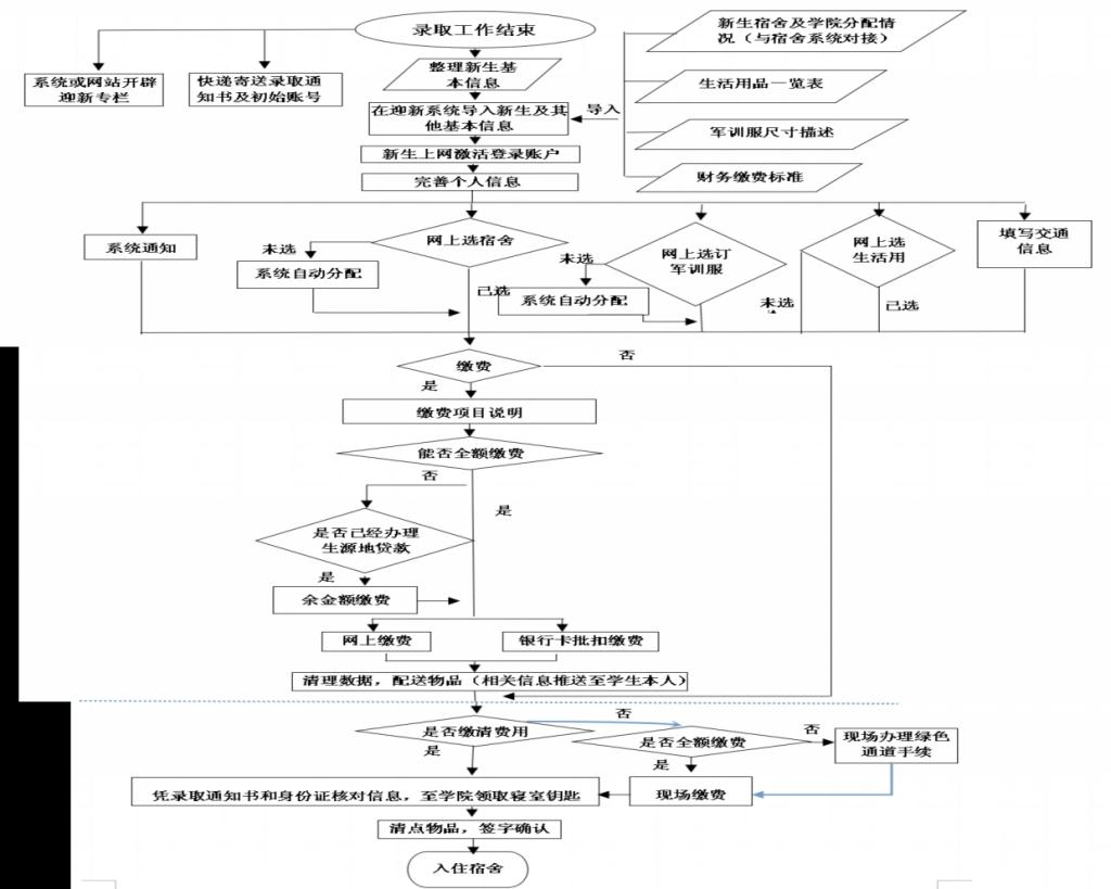 新生凭身份证或录取通知书到迎新志愿者服务站领取卡包(内含校园卡、开水卡、热水卡、纸质报到单等)→志愿者领新生入住公寓(确认置于床上的生活用品和军训服装)→志愿者扫码确认新生报到并回收签好字的纸质报到单→各二级学院指定材料收集点上交相关材料→没有办理网上缴费的到财务处现场缴费→没有办理网上生活用品选购且需要购买的到志愿者服装站旁的指定地点购买生活用品→新生体检。